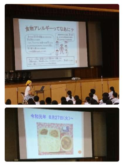 食物アレルギーについての話や準備物、2学期からの時程、給食当番の仕事についての説明などがありました。