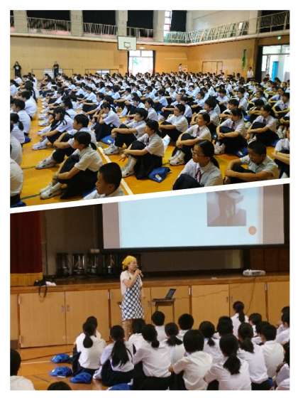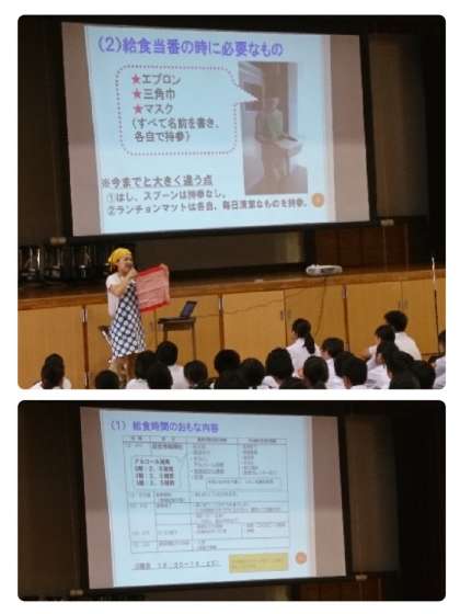 谷田先生も、全校集会で三角巾・エプロン・白のマスクを着用されていました。目で、耳で、とても分かりやすく説明いただきました。