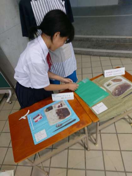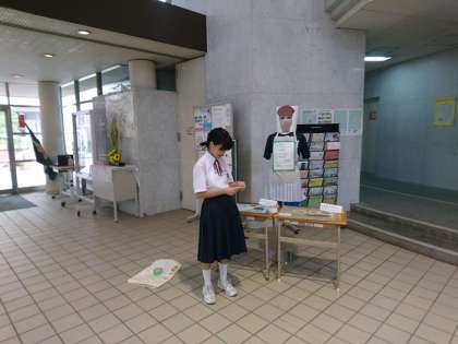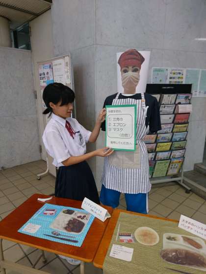 少しでも生徒のみなさん・保護者の方々にイメージしてもらえるよう、エプロンやランチョンマットをホールに展示しました。
