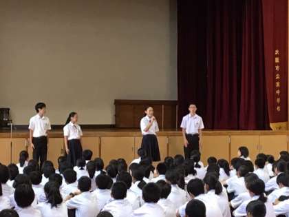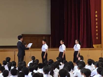 続いて校長先生から、大阪市教育委員会事務局と大阪市会事務局が共催で行われる、大阪こども市会−中学生市会ーの子ども議員に選出された4名の代表生徒の紹介をされました。そして、選出された4名から、大阪子ども市会に臨む決意や意気込みを、全東中生に力強く発表してくれました。東中の代表として、大阪市の中学生の代表として、松井市長さんに学校や教育がもっともっと良くなるためには何が必要か、提案してきてください。普段からの生徒会活動や、日々の活動の成果が実を結びましたね!