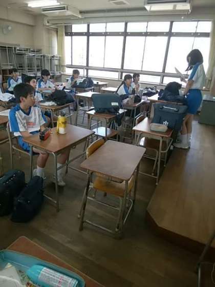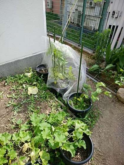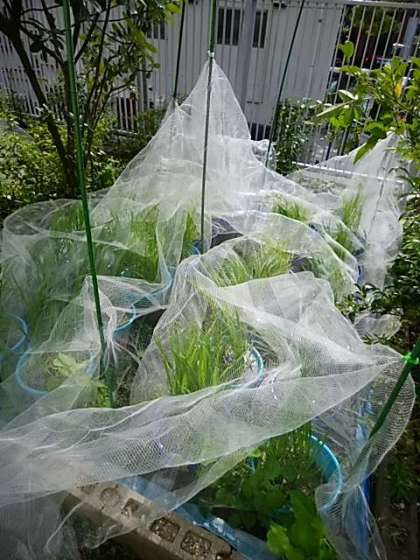 稲だけでなく、このかん、カラスに襲われていると思われる作物にも、切り分けたネットの残りを利用して、対策を講じました。このあと、夏休み期間中の水やり当番を決めました。