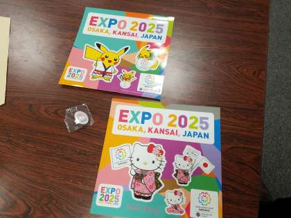 後半は大阪関西万博の開催についてと、大阪臨海部の開発についての講義を聞きました。積極的に質問もでき有意義な時間になりました。参加記念として、大阪関西万博のステッカーとピンバッジをいただきました。