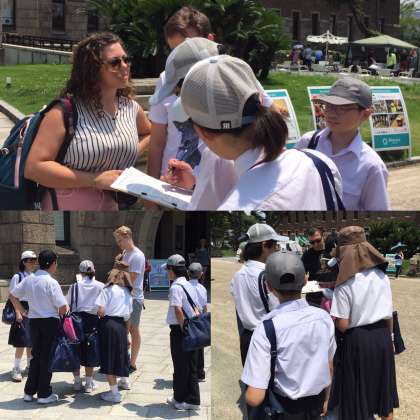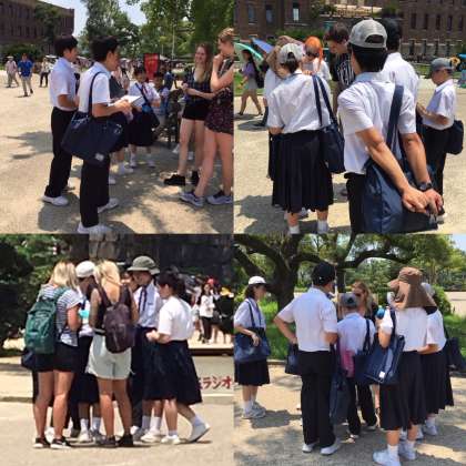 インタビューする人、聞いた内容をメモする人、写真を撮る人。それぞれの役割を順番に務めました。1年生も、緊張しながらインタビューできました。約1時間で、全グループが目標達成できました。いちばん多かったグループは、用意していたインタビュー用紙とお礼のカードをすべて使い果たしました。今日はこの3日間でいちばんの暑さだったように思います。暑い中、よく頑張りました!明日もこの調子で!