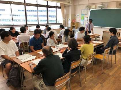 生活指導部会では東中学校の生徒指導主事の西垣先生が中心となり、事例資料を元に研修を行っています。夏休みを利用して先生たちも交流を深めています。