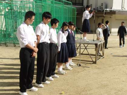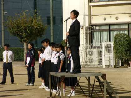 校長先生からは、体育大会の感想を述べられ、「1度しかないチャンスもある」というお話に続いて、もうすぐテスト1週間前になることに向けて「目標を持って具体的に今何をすべきか」について、そして最後に、明日の生徒会役員選挙に伴って、前期生徒会役員の労をねぎらい、校長先生の音頭で全校生徒全員で感謝の拍手を送り、全校集会が終わりました。