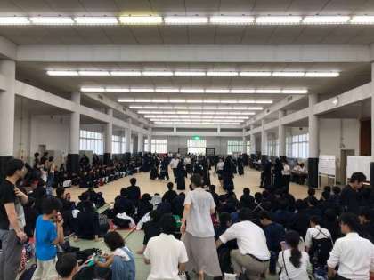 広い会場で多くの受審者がいますが、東中ブルーの「百折不撓」面タオルが目立っています!大きく、強く、速く、軽やかに打突することが合格のポイントです。全員合格を期待します!頑張れ東中学校剣道部!