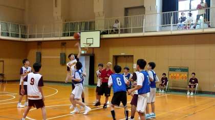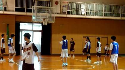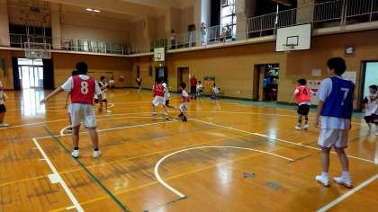 課題を持って練習試合に取り組んでいます。強い1対1のオフェンスと簡単に抜かれないディフェンスを心がけてのゲームです。強いプレイが随所に見られます。