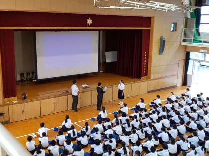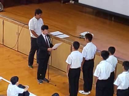 夏季休業中に部活動を始め、様々な分野での東中生徒の活躍が見られました。その中でも頑張りたたえられた東中生への表彰伝達が行われています。