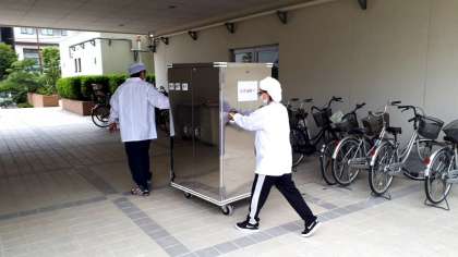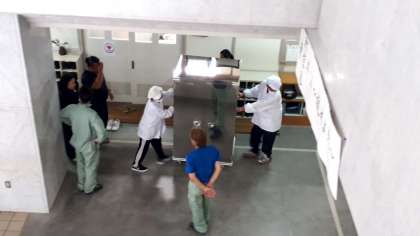 今日からデリバリー弁当による選択給食から学校調理方式による全員給食が始まります。