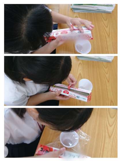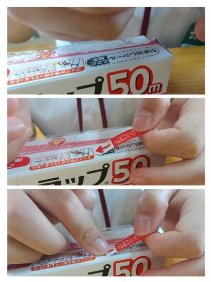 食品用ラップフィルムの開封、そして使い方を実践のなかで学んでいます。