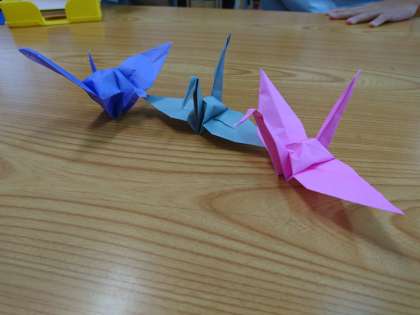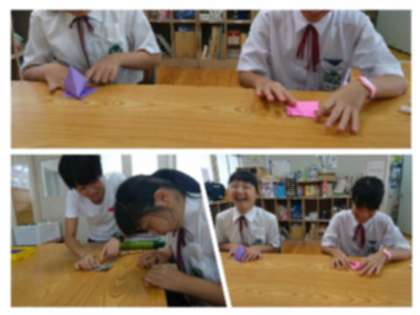 また授業の後半では、学年で取り組む前段階として、鶴の折り方を学びました。「難しい〜!」と言いながらも、前向きに取り組んでいました。