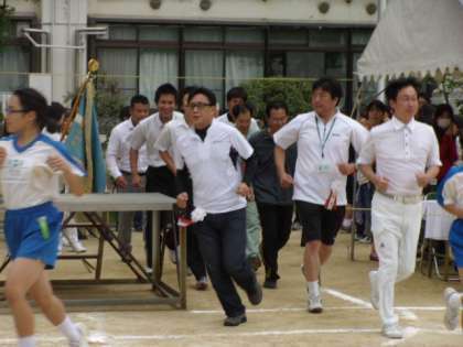 白熱したクラブ対抗リレーに続いて、プログラムNO.13 来賓・PTAvs職員による。恒例の紅白玉入れです。職員が紅組、来賓・PTAが白組でした。白組の様子は、PTA広報委員会で記事をもらうことにして、ここでは、紅組のみをご紹介します。