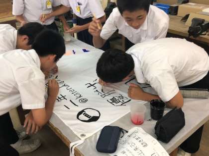 仲間と協力をしながら、学級旗の作成に一生懸命に取り組んでいます。