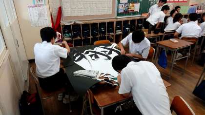 本日6限目は体育大会のグッズ作成や応援歌作りなどの取り組み2日目です。各クラス趣向をこらした物作りが進められています。また、応援部隊は縦割り応援があるために、来週には後輩へ教える必要があります。真剣な中に笑いがあります!