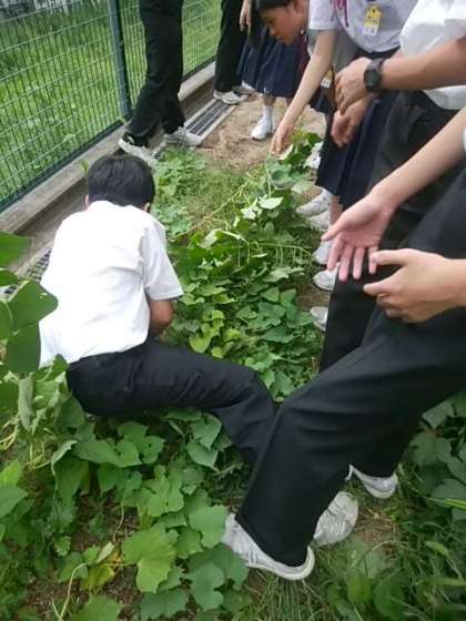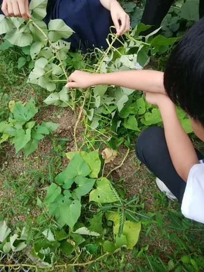 次に、サツマイモ畑に行きました。サツマイモは伸びたツルが土に触れると、触れている部分から根が伸びて、そのにイモをつけようとします。そうなると、あちこちにイモが出来てしまいますが、ひとつひとつが小さくなってしまいます。大きなイモを作るためには、そのような根をちぎる必要があります。添付写真はその様子を撮影したものです。