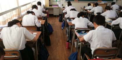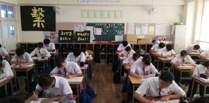 1限目、3年4組の国語の時間の様子です。この時間は、現在学習をしている「おくのほそ道」の序段の暗誦筆記テストを行っています。