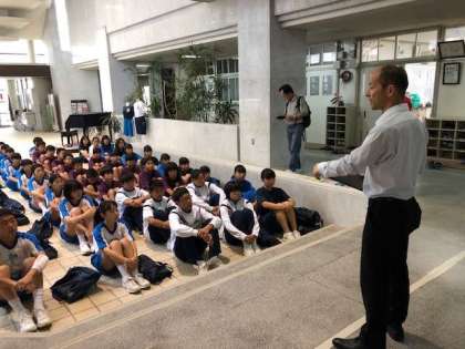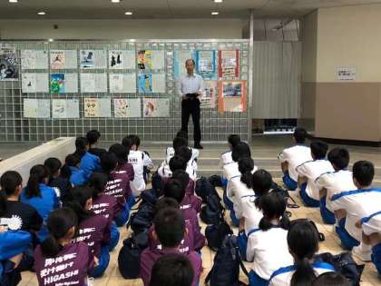 東中学校のホールに集合して教頭先生から防災訓練に参加する意義について話がされています。まもなく南大江小学校に出発します。