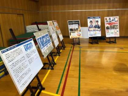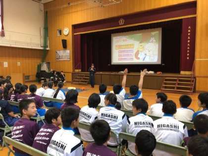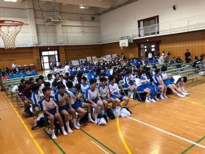 南大江小学校に到着して、防災訓練が始まりました。東中生も本部、情報班、総務班、避難誘導班、救護部、食糧部、物資部などにグループ分けされて実践的な防災訓練に参加します。