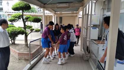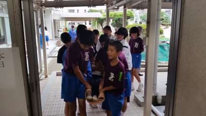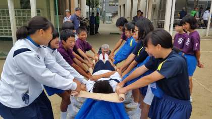 毛布で作った担架で怪我人を運ぶ訓練をしています。