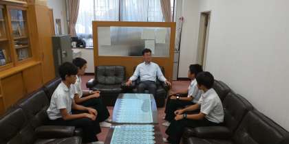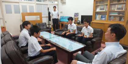 放課後の校長室では、サッカー部 3年生が、校長先生に夏の大会結果報告をしています。