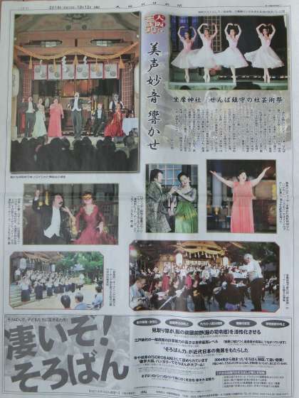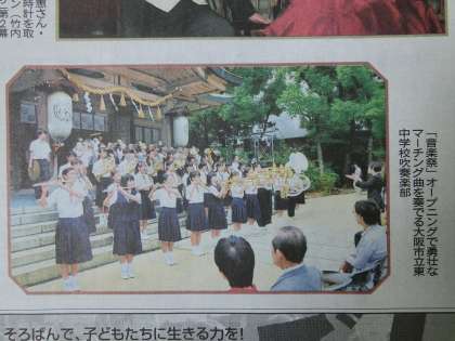 吹奏楽部の活動を10月6日のHPで「せんば鎮守の杜の芸術祭 吹奏楽部参加」としてご紹介しましたが、10月12日付の大阪日日新聞の大阪ギャラリーのコーナーで「美声妙音響かせ」というタイトルで紹介されました。