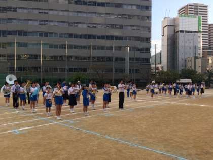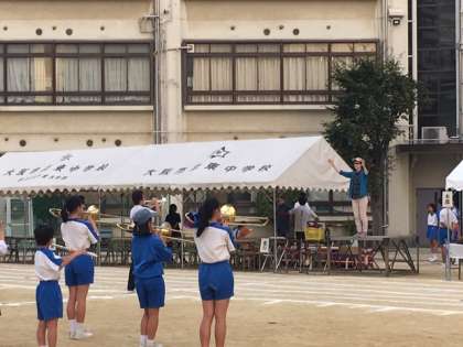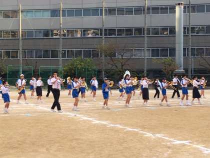 体育大会では、毎年恒例となっている吹奏楽部によるマーチング!!