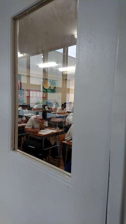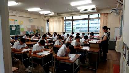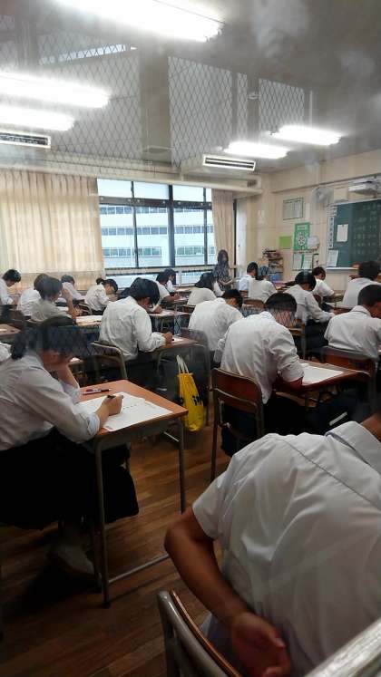 給食を終えて最後のテストが始まりました。教科は英語、リスニング問題からのスタートです。真剣にメモをとりながら聞いています。