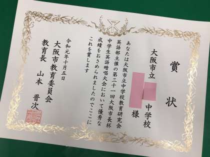 出場者25名中、見事!大阪市教育長賞を受賞しました。また市長賞の生徒と2人、代表として、10月19日(土)鶴見区民センターで行われる第28回大阪市立中学校総合文化祭の英語部暗唱に出場します。本当によく頑張りました。