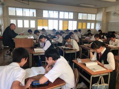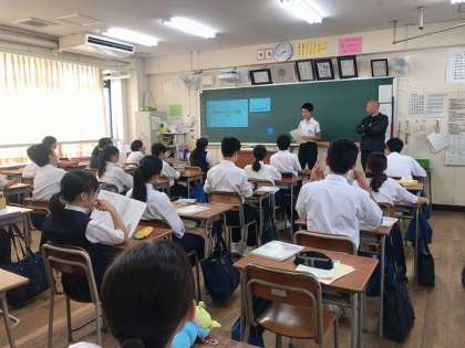 3年生は、情報機器実行委員会より情報モラルについてのアンケート結果をパワーポイントを用いて説明し、授業が進められています。