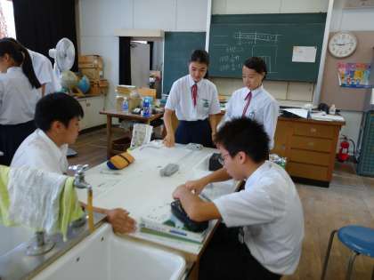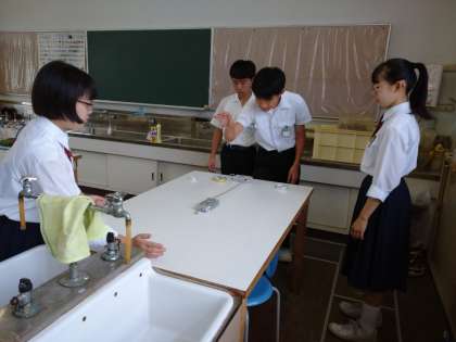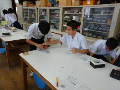 理科では、物体の運動についての学習を行っています。目に見えない力と、物体の動きの関係を考えるために、本日は実際に台車を走らせて、記録タイマーで運動の様子を測定しました。班で互いに教え合って、1人1回ずつ記録を取りました。