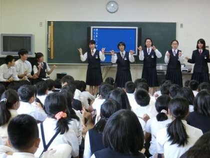 校区にある小学校(この日は玉造小学校と南大江小学校の2校)の6年生を対象に、東中学校のことを少しでも知ってもらおうと、DVDを使った各行事の紹介や、ESS部による歌やゲームの発表を行いました。(写真は玉造小学校の様子です)