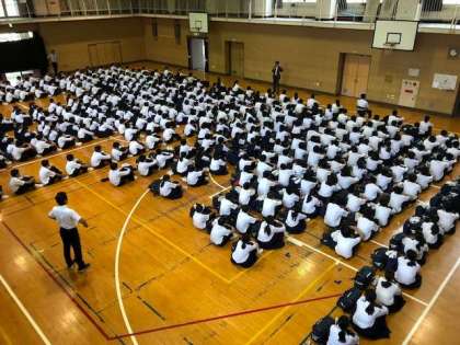 中間テスト終了後、体育館では第2回部活動集会が3年生の部活動部長会議のメンバー主催で実施されています。