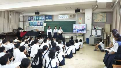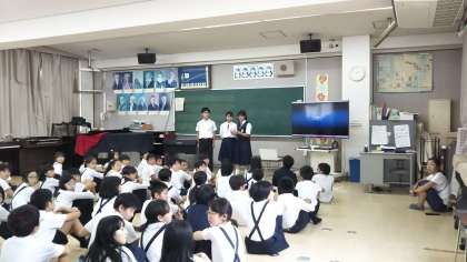 6年生の皆さんに東中学校のことを知ってもらい、進学の不安をなくしてもらうために動画を用いて説明をしています。また、ESS部が英語のクイズを用意して、皆さんに答えてもらいました。答えも英語でバッチリ返ってきました!