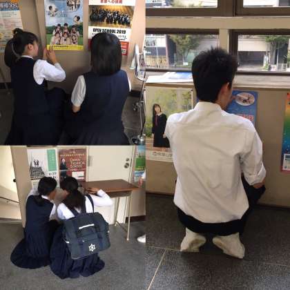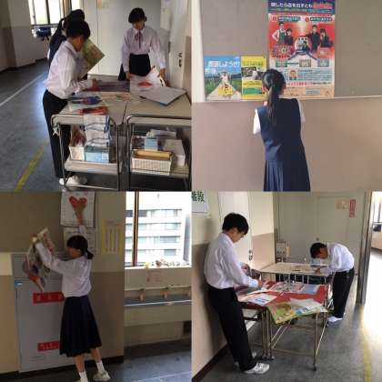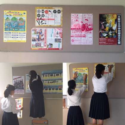 話し合いのあとは、各学年に分かれて掲示物の貼り替えを行いました。各学年2人ずつ経験者がいます。その生徒を中心に協力して行いました。掲示物の量も多く、最初なので、時間がかかりましたが、キレイに見やすく貼ることができました。