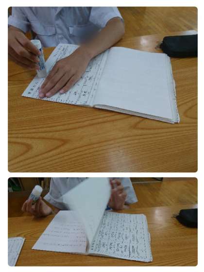 この時間は、各教科のノート整理をしています。ノートに貼ることができていないプリントがあったので、先生と確認しながら貼りました。