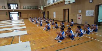 マットの準備を1分30秒で行う指示に、男子生徒から「1分15秒にしましょう!」との前向き発言もみられました。
