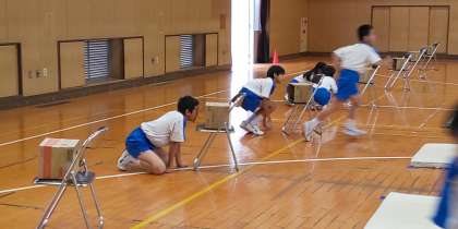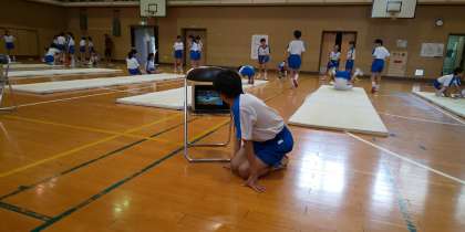 技の観点を頭に入れて、班別練習です。技の練習後は、タブレットの遅延動画システムを活用して自分の演技の映像を熱心に確認しています。