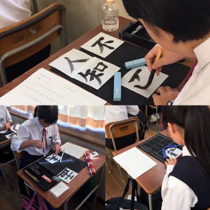 授業では、2学期に学んだ「論語」や2年生で学習した「漢詩」などの漢文を、毛筆を用いての書写活動が実践されていました。