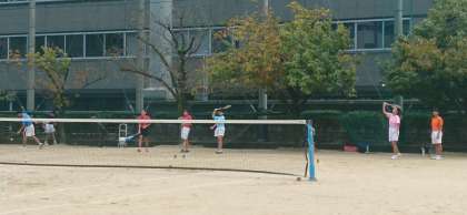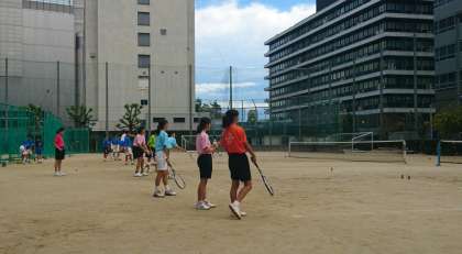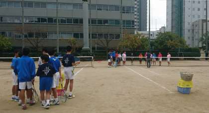 昨日からの雨の影響で、今日はコート2面での練習です。そのような中でも、コート1面で3コースのラリーを実践したり、周りの動きを見ながら積極的にコートに入っていくことで、ボールを打つ回数は十分に確保することができます。