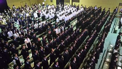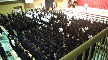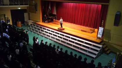 合唱コンクール前の発声練習も兼ねての全体合唱です。東中生の歌声が体育館に響きわたっています。