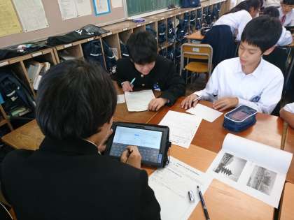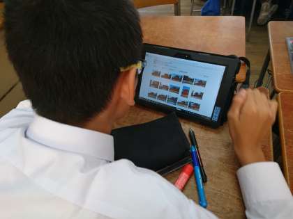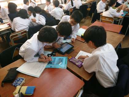 今日の6限目は、校外学習(奈良)にむけて、調べ学習をしています。タブレットを活用して、調べます。