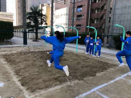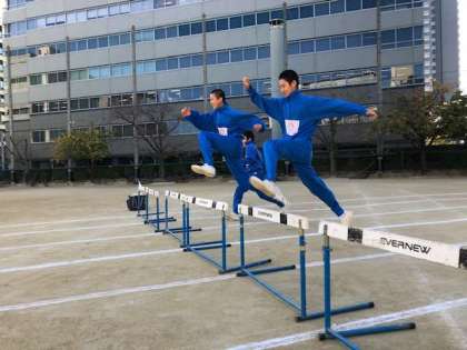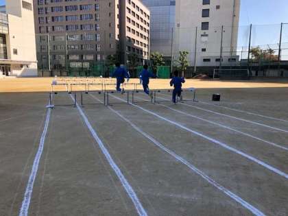 2年生の体育は陸上競技を学習しています。前半は男子が走り幅跳び、女子がハードル走を学習しました。今日から後半に入り、男女が入れ替わって学習しています。