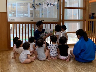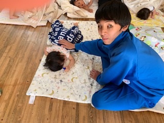 保育所での体験のようすです。お昼寝のお手伝いをさせていただいています。