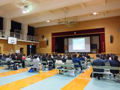 本日、3年生は5限終了後に下校し、体育館で保護者向けの進路説明会が行われています。大手前高校から校長先生に来校いただき、大阪府内の高校の種類や特徴、進路選択におけるポイントを説明していただいています。