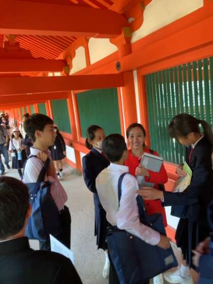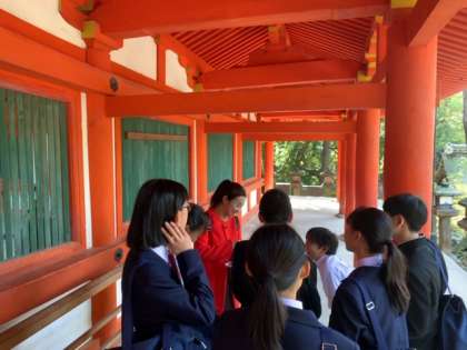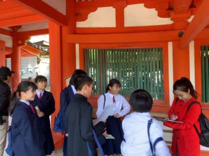 各班が、春日大社で先生のチェックを受け、問題に挑戦しています。