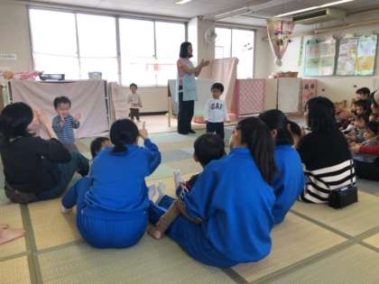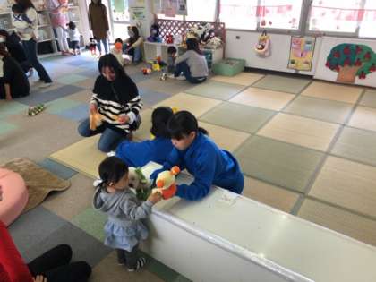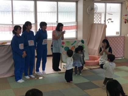 子育て支援センターでは生徒たちが手作りで作成した野菜のグッズを使った手遊びを一緒にしていました!