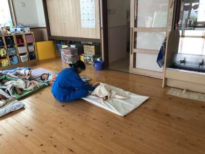 乳児たちはお昼寝の時間のようです。なかなか寝付けない子に優しく寄り添って体をさすっています。頑張っています!