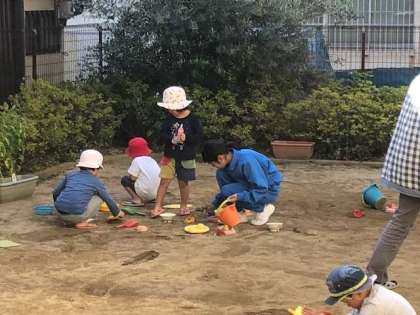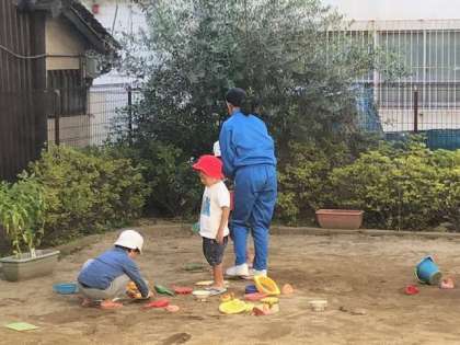 保育園での体験です。園児たちと元気に園庭で遊んでいます。