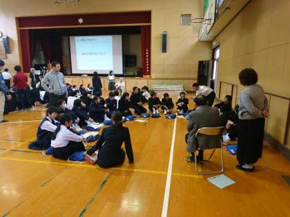 グループに分かれて、講師の方々と交流しています。身振り、表情で相手に伝えようと東中生は頑張っています!