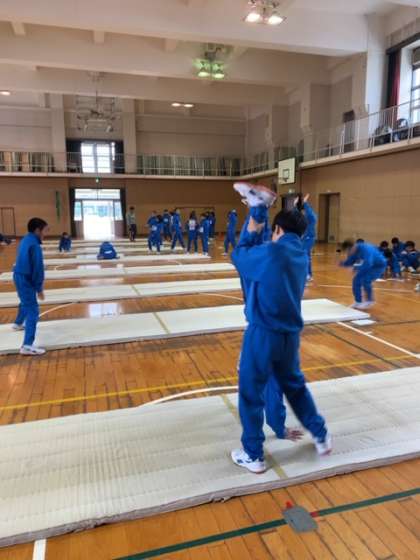 本日、1年生3・4組はマット運動の発表に向けて班ごとに練習しています。